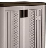 Suncast - Lockable doors doors are capable of locking to protect your valuables Sleek design platinum storage cabinet that fits into the corner of a garage creating an attractive space Durable double wall resin construction that is resistant to warping rusting and denting Reinforced shelving metal reinforced shelving that holds up to 75 lbs